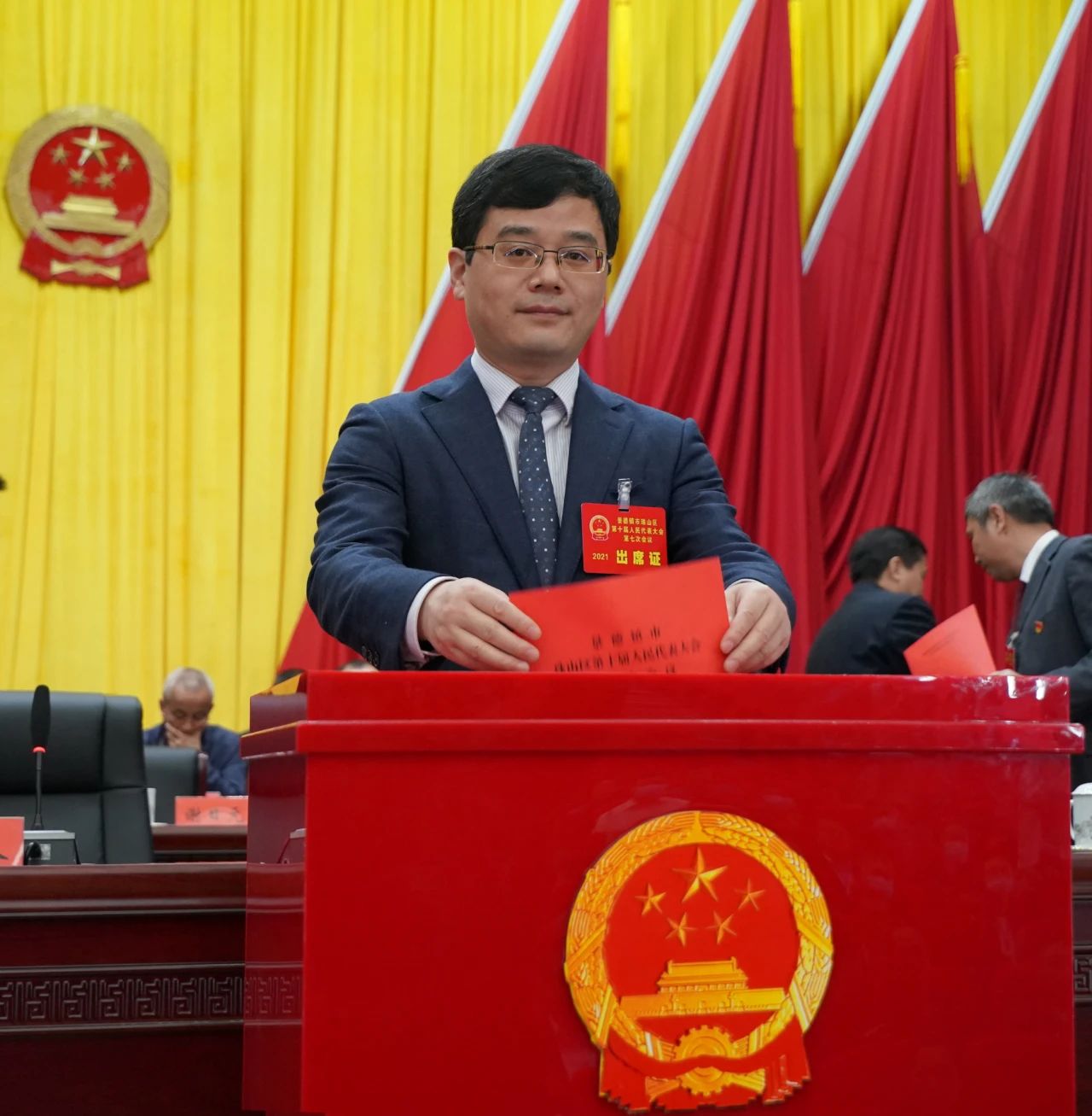 新当选的珠山区第十届人大常委会副主任徐智勇在宣誓台前,面朝国徽,向宪法庄严宣誓。