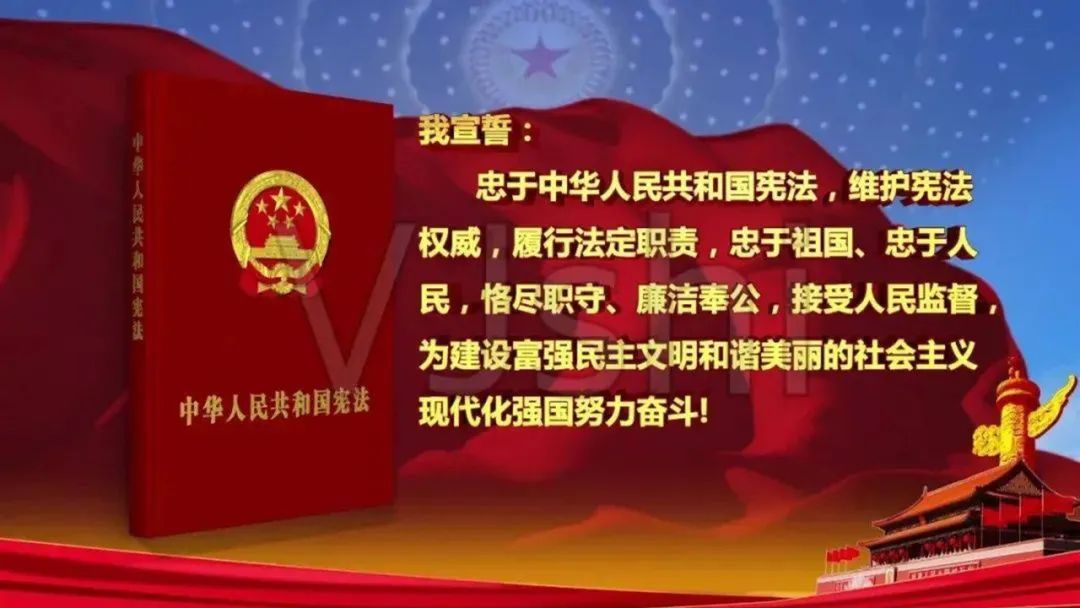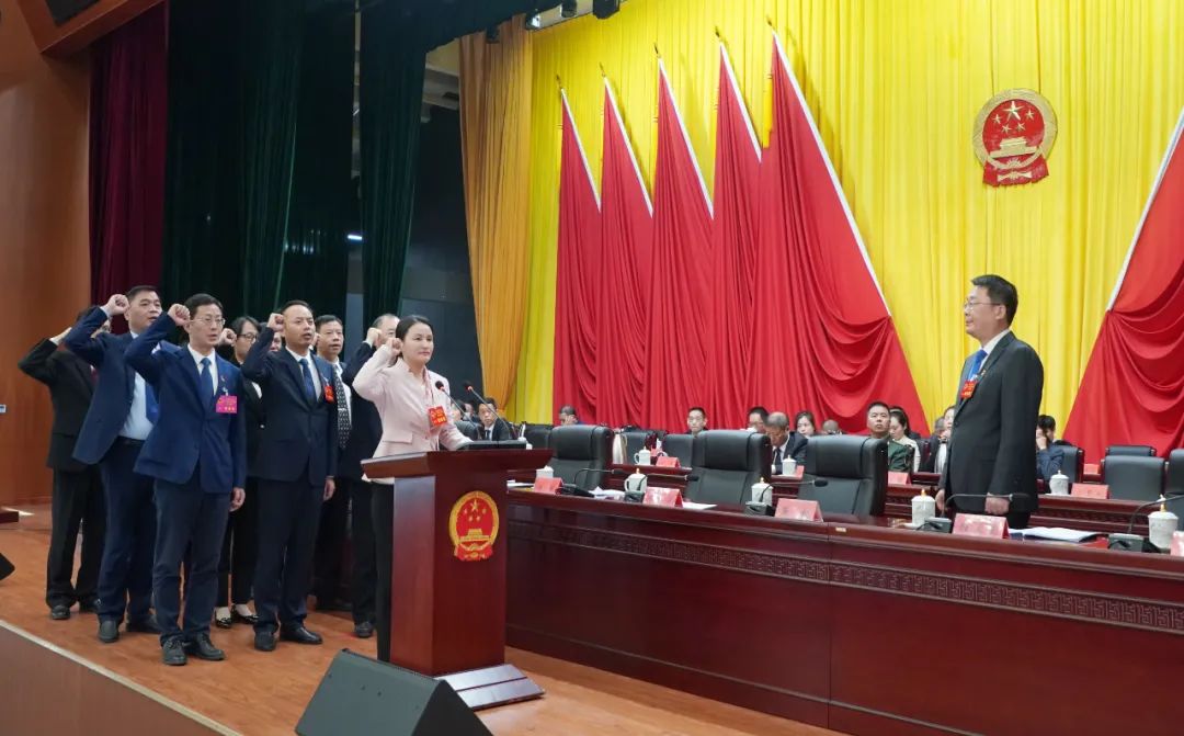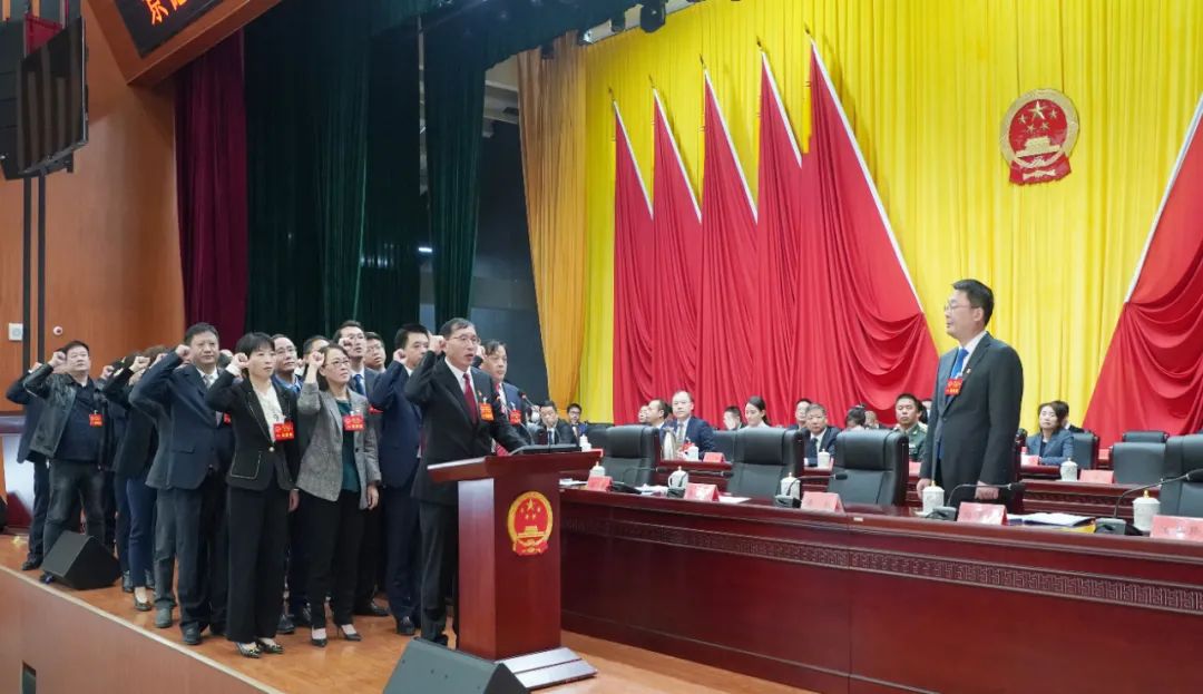 新当选的珠山区人民政府区长徐华,带领副区长、区监察委员会主任、区人民法院院长宣誓。
