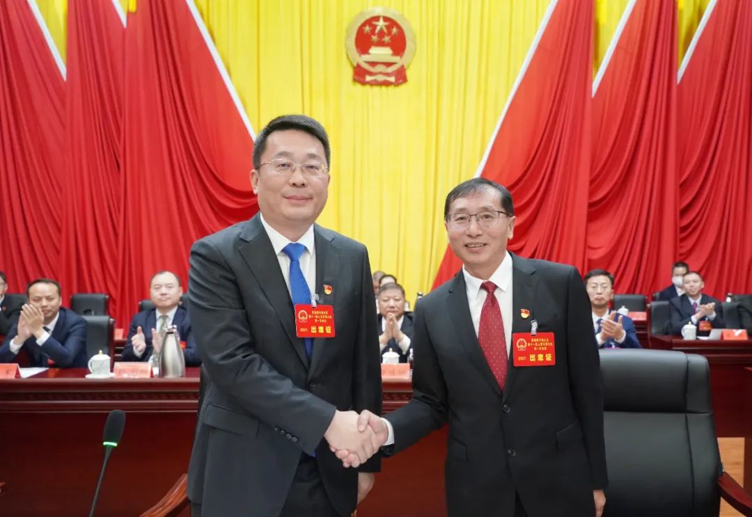 珠山区委书记高翔,同新当选的区人大常委会主任汪良,区人民政府区长徐华分别握手,表示热烈祝贺。